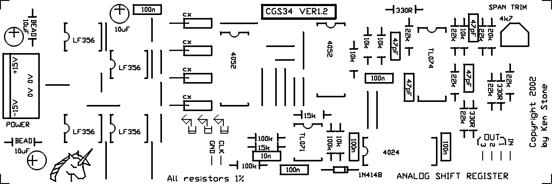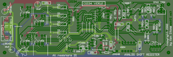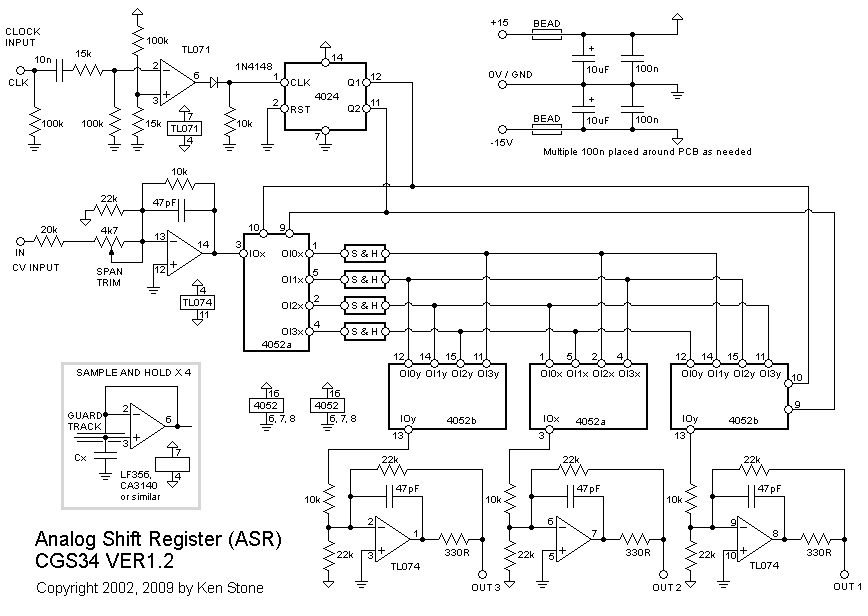 Analog Shift Register The previous versions can be found here. This module is an analog control voltage shift register, three stages in length. It duplicates the functionality of the Serge ASR, but goes about it in a very different way. It is great for producing "arabesque-like" sequences, trills etc., when used with VCOs. Of course it's use is not limited to VCOs only. Unlike ASRs produced using "bucket brigade" techniques, the CV outputs are constant from the beginning of the cycle to the end - there is no "charge period" in which a brief glide is heard. The CV input/output range of the ASR is approximately +/- 10V. How to use this module: Connect the CV input to a voltage source such as a keyboard or sequencer. Connect the three CV outputs to the three modules to be controlled. Connect the clock input to a LFO or other low frequency trigger source. To cascade the unit with others, connect the clock inputs to the same trigger source, and connect the third CV output of the first ASR to the CV input of the second ASR. Unlike the Serge ASR, there is no need to used delayed trigger pulses. A little on how it works: The ASR is nothing more than a 4 stage analog memory. Each cell of this memory is a capacitor, followed by a buffer. Addressing each stage of this in turn is half of a 4052 4 pole analog switch. As each cell is addressed, it is forced to follow the incoming voltage. The cell remains connected to the incoming voltage for a full clock cycle, giving it ample time to reach the correct level. At the same time as this is happening, there are three other 4 pole analog switches that are pointing to each of the other three cells. The first of these points to the cell filled the previous clock cycle, the second to the cycle before than, and the third to the one before that. As such, once each cell is filled, it remains that way for 3 clock cycles, then is filled with a new voltage on the fourth. The other three cells are cycled in turn to the 1st, 2nd and 3rd outputs. The TL071 and 4024 form the clock pulse to address converter. The remaining circuitry is an input buffer and three output buffers designed to adapt the voltage to that suitable for switching by the 4052. The input range of the ASR itself is approximately +/- 10V.